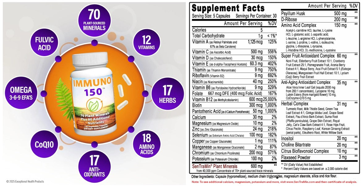 IMMUNO 150 was formulated to strengthen immune systems and correct many abnormalities.ts 70 plant-derived colloidal mineralsare the key to its success. Blended with 80 carefully selected, premium nutrients, it's one of the finest supplements available.
